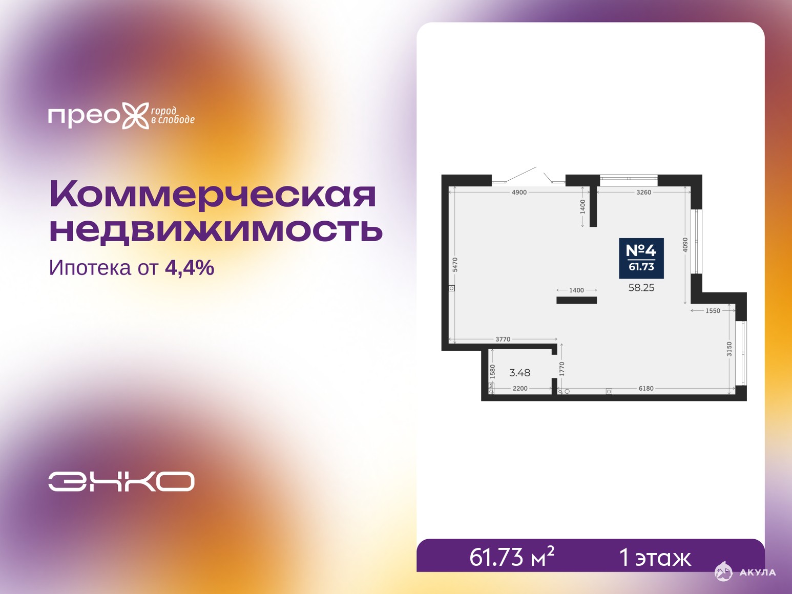 Помещение свободного назначения на 1 этаже, общая площадь 61.73 кв.м. Стоимость аренды 111, 114 руб. в месяц, это 1800 руб. за кв.м.