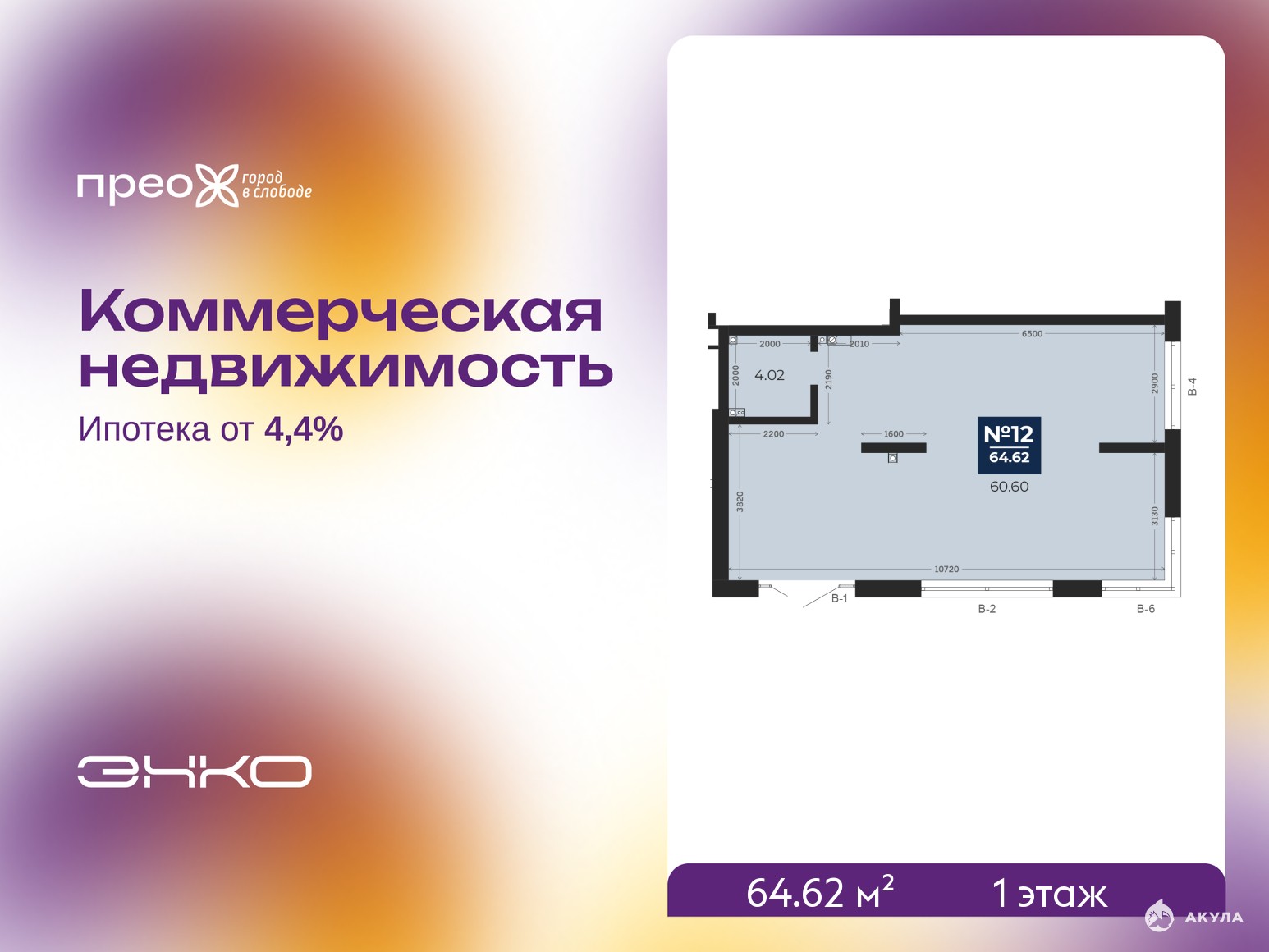 Помещение свободного назначения на 1 этаже, общая площадь 64.62 кв.м. Стоимость аренды 130, 000 руб. в месяц, это 2011 руб. за кв.м.