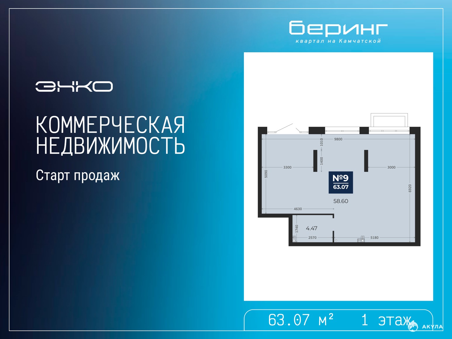 Помещение свободного назначения на 1 этаже, общая площадь 63.07 кв.м. Стоимость аренды 100, 800 руб. в месяц, это 1598 руб. за кв.м.