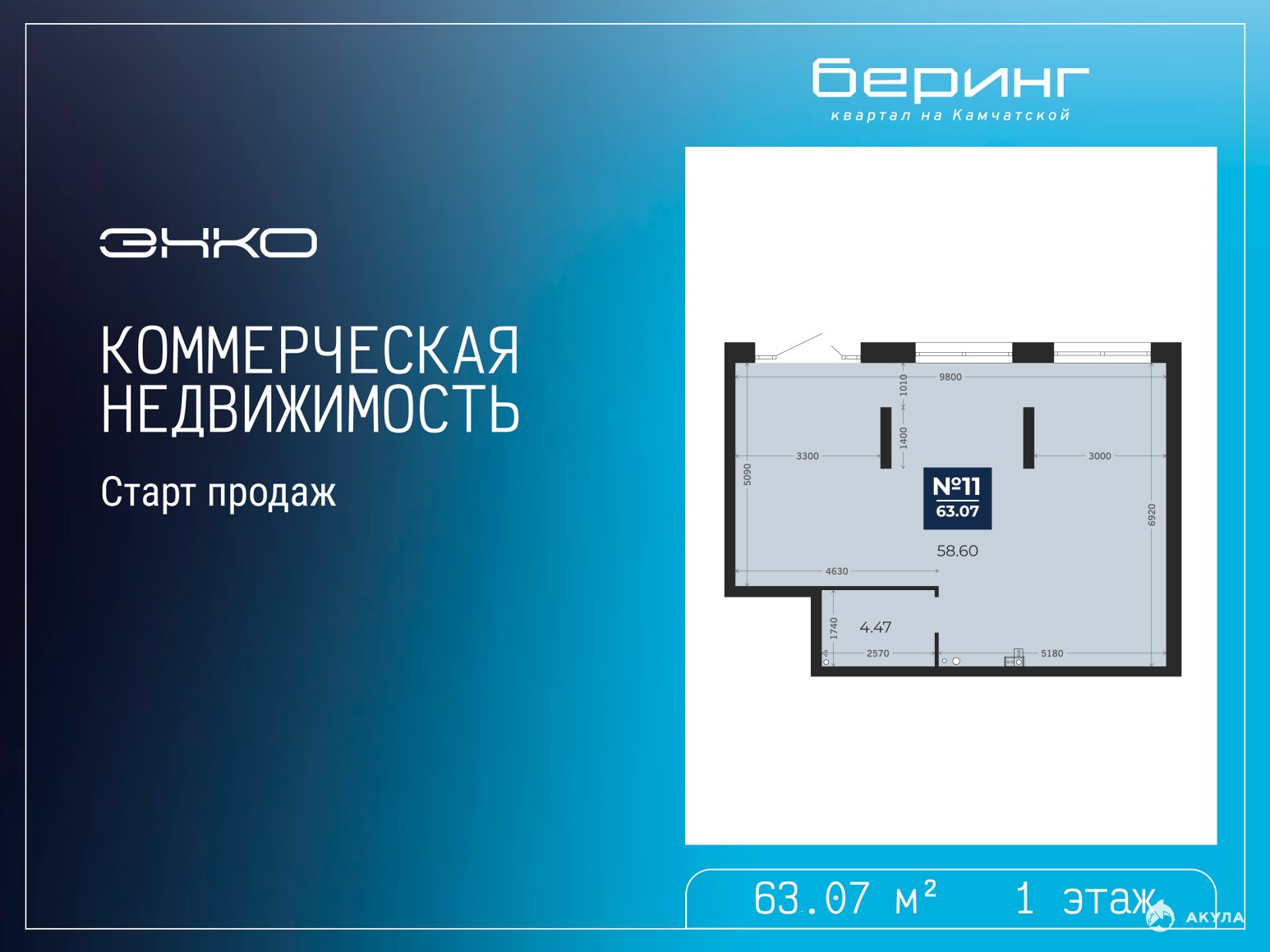 Помещение свободного назначения на 1 этаже, общая площадь 63.07 кв.м. Стоимость аренды 100, 912 руб. в месяц, это 1600 руб. за кв.м.