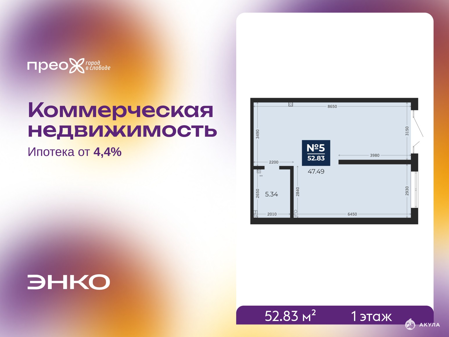 Помещение свободного назначения на 1 этаже, общая площадь 52.83 кв.м. Стоимость помещения 16, 050, 000 руб., цена за кв.м 303, 804 руб.