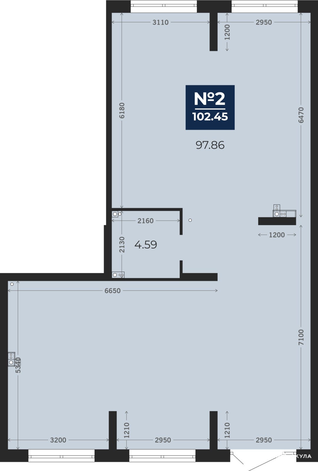 Помещение свободного назначения на 1 этаже, общая площадь 102.45 кв.м., без отделки. Стоимость помещения 17, 865, 000 руб., цена за кв.м 174, 377 руб.