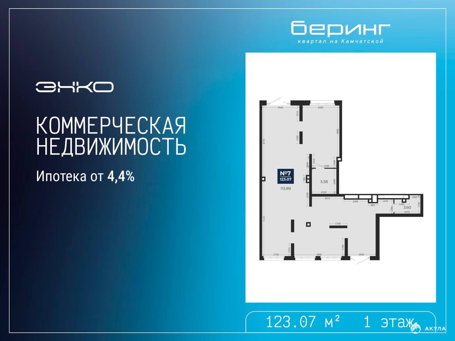 Помещение свободного назначения на 1 этаже, общая площадь 123.07 кв.м. Стоимость помещения 21, 674, 192 руб., цена за кв.м 176, 112 руб.