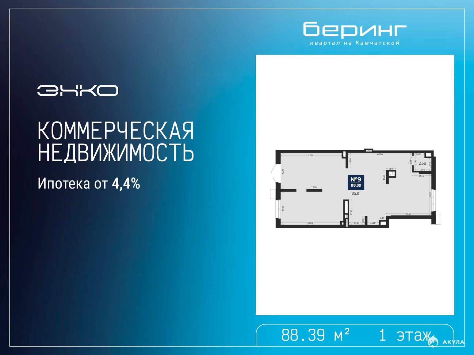 Помещение свободного назначения на 1 этаже, общая площадь 88.39 кв.м. Стоимость помещения 16, 620, 000 руб., цена за кв.м 188, 030 руб.