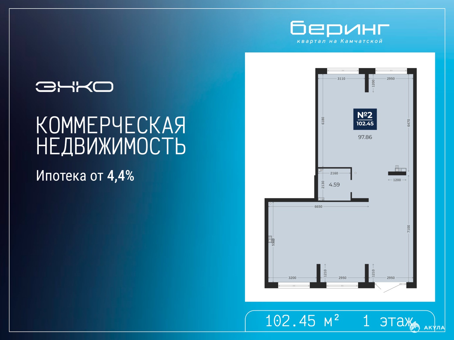 Помещение свободного назначения на 1 этаже, общая площадь 102.45 кв.м., без отделки. Стоимость помещения 20, 831, 000 руб., цена за кв.м 203, 328 руб.