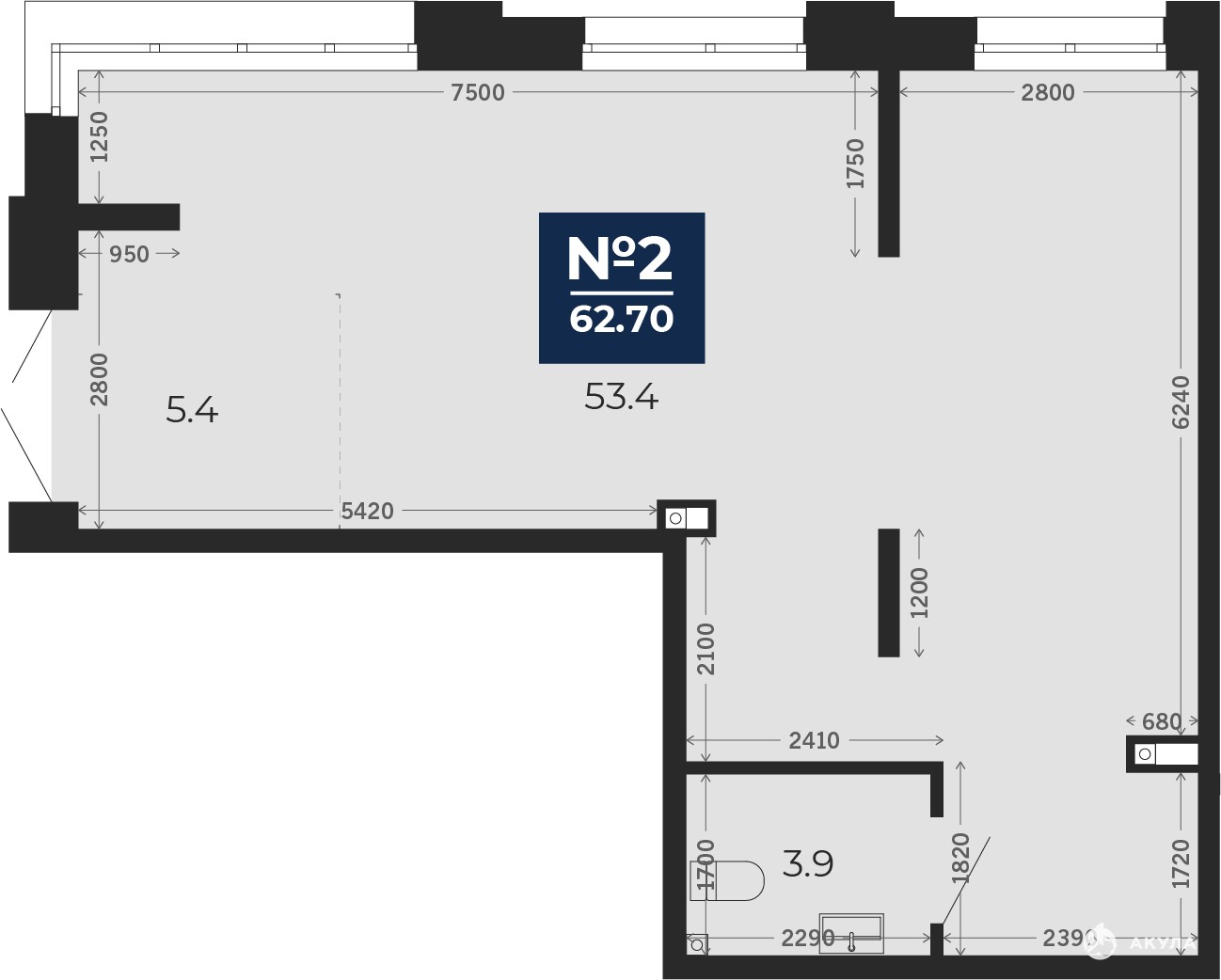 Помещение свободного назначения на 1 этаже, общая площадь 62.7 кв.м., без отделки. Стоимость помещения 14, 025, 000 руб., цена за кв.м 223, 684 руб.
