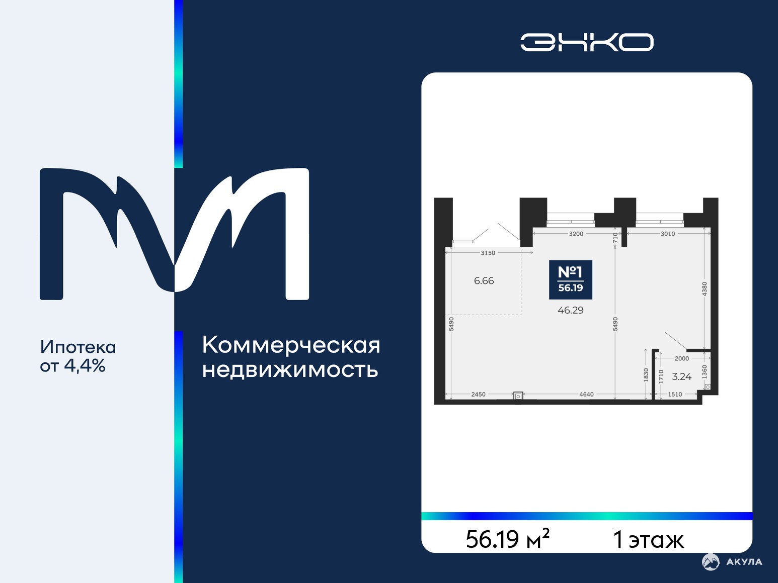 Помещение свободного назначения на 1 этаже, общая площадь 56.19 кв.м. Стоимость помещения 12, 170, 000 руб., цена за кв.м 216, 586 руб.