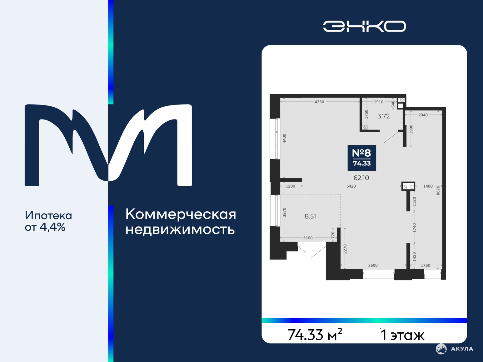 Помещение свободного назначения на 1 этаже, общая площадь 74.33 кв.м. Стоимость помещения 14, 900, 000 руб., цена за кв.м 200, 457 руб.