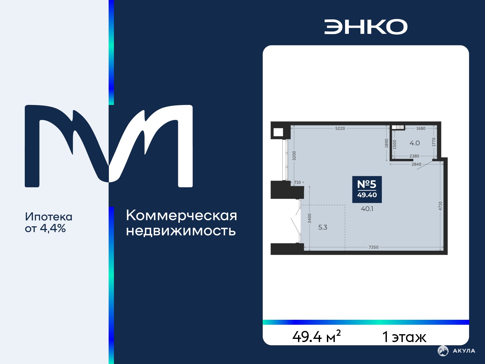 Помещение свободного назначения на 1 этаже, общая площадь 49.4 кв.м. Стоимость помещения 13, 860, 000 руб., цена за кв.м 280, 566 руб.