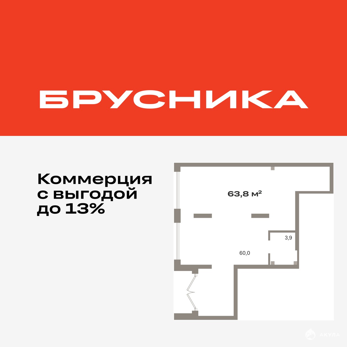 Помещение свободного назначения на 1 этаже, общая площадь 63.83 кв.м., без отделки. Стоимость помещения 13, 230, 000 руб., цена за кв.м 207, 269 руб.