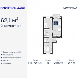 Продается двухкомнатная квартира от застройщика с предчистовой отделкой в ЖК "Мириады" на 2 этаже. Общая площадь: 62.1 кв.м., жилая: 24.2 кв.м., площадь просторной кухни-столовой: 20.8 кв.м. Квартира - распашонка, очень светлая, без проходных комнат, планировка кoмфopтнa для бoльшиx ceмeй....