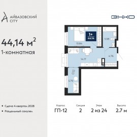 Продается 1-комн. квартира с предчистовой отделкой в ЖК "Айвазовский City" на 2 этаже. Общая площадь: 44.14 кв.м., жилая: 13.84 кв.м., площадь просторной кухни-столовой: 14.17 кв.м. Все окна выходят на одну сторону. В квартире один совмещенный санузел. Высота потолков 2.7 м. Дом монолитный,...