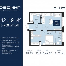1-комн. квартира в ЖК "Беринг" на 13 этаже. Квартира без отделки, новый собственник может сделать ремонт по своему проекту. Общая площадь: 42.19 кв.м., жилая: 13.09 кв.м., площадь просторной кухни-столовой: 15.92 кв.м. Все окна выходят на одну сторону. В квартире одна лоджия, один...