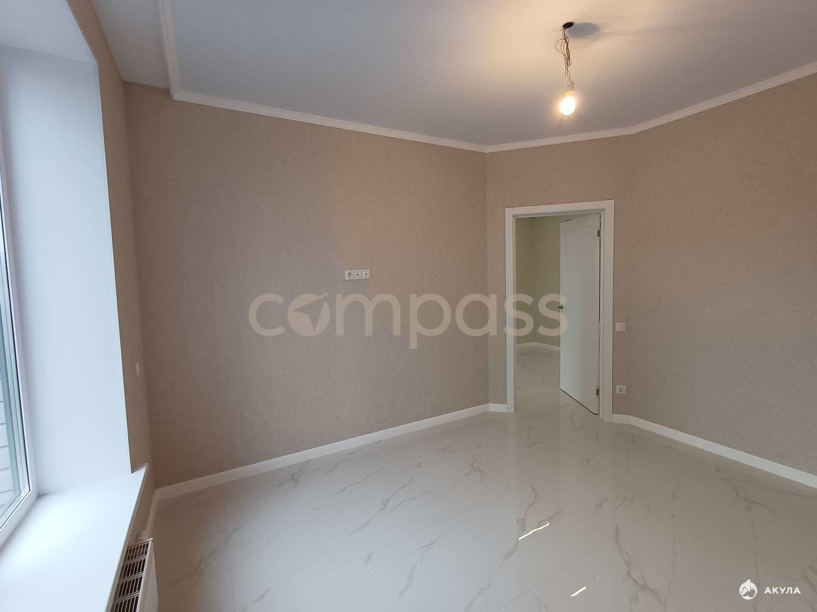 Выполнен ремонт из качественных материалов: напольная плитка - керамогранит, ламинат, натяжные потолки с точечными светильниками, межкомнатные двери, в санузлах установлена сантехника