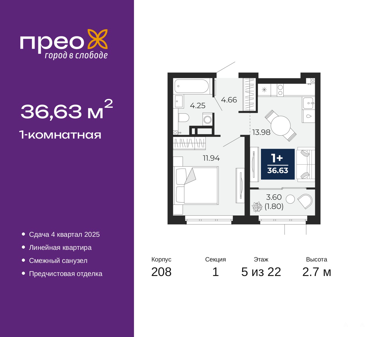 Продается 1-комн. квартира с предчистовой отделкой в ЖК "Прео" на 5 этаже. Общая площадь: 36.63 кв.м., жилая: 11.94 кв.м., площадь просторной кухни-столовой: 13.98 кв.м. Все окна выходят на одну сторону. В квартире один совмещенный санузел. Высота потолков 2.7 м.