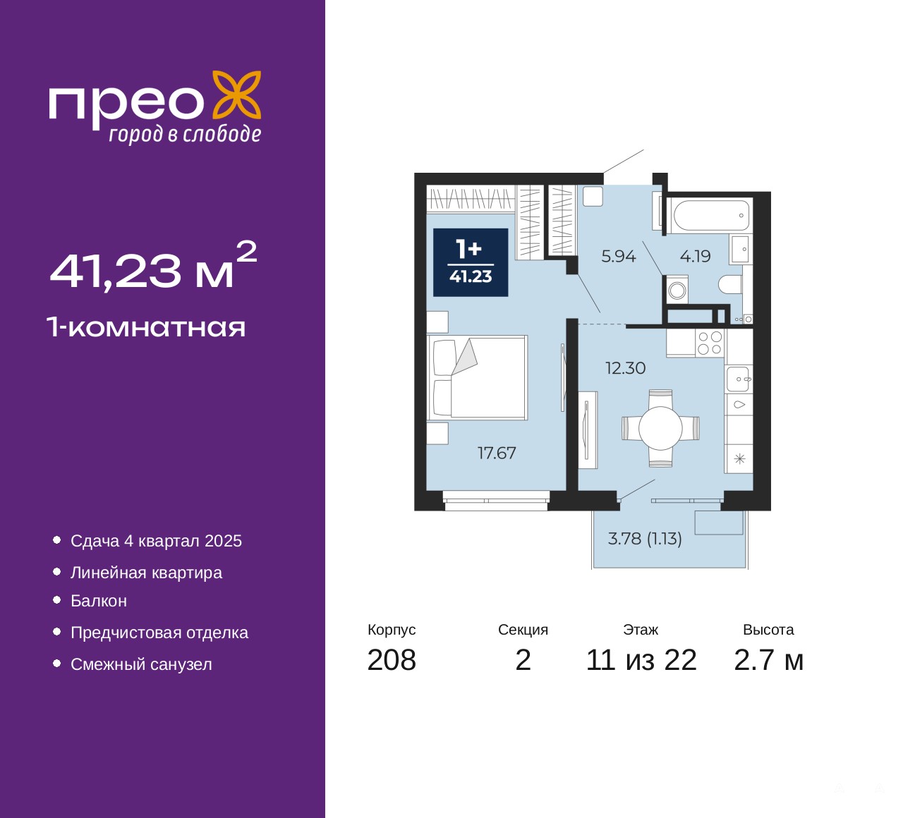 Просторная однокомнатная квартира с предчистовой отделкой в ЖК "Прео" на 11 этаже. Общая площадь: 41.23 кв.м., жилая: 17.67 кв.м., площадь просторной кухни-столовой: 12.3 кв.м. Все окна выходят на одну сторону. В квартире один балкон, один совмещенный санузел. Высота потолков 2.7 м.