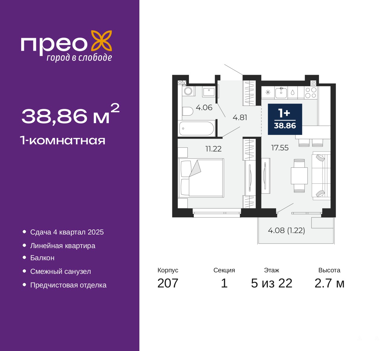 Продается однокомнатная квартира с предчистовой отделкой в ЖК "Прео" на 5 этаже. Общая площадь: 38.86 кв.м., жилая: 11.22 кв.м., площадь просторной кухни-столовой: 17.55 кв.м. Все окна выходят на одну сторону. В квартире один балкон, один совмещенный санузел. Высота потолков 2.7 м.