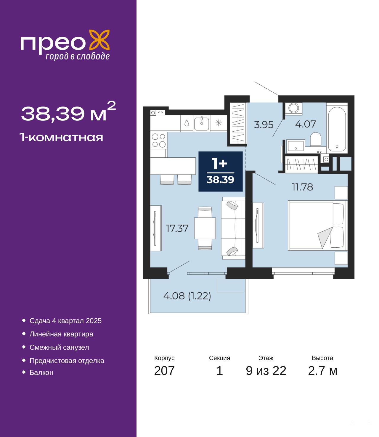 Просторная однокомнатная квартира с предчистовой отделкой в ЖК "Прео" на 9 этаже. Общая площадь: 38.39 кв.м., жилая: 11.78 кв.м., площадь просторной кухни-столовой: 17.37 кв.м. Все окна выходят на одну сторону. В квартире один балкон, один совмещенный санузел. Высота потолков 2.7 м.