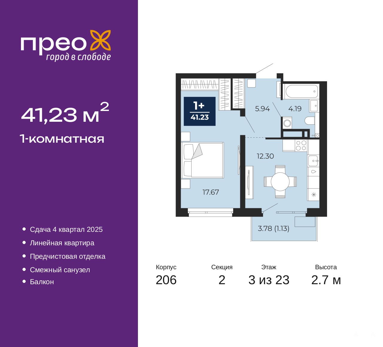 Однокомнатная квартира с предчистовой отделкой в ЖК "Прео" на 3 этаже. Общая площадь: 41.23 кв.м., жилая: 17.67 кв.м., площадь просторной кухни-столовой: 12.3 кв.м. Все окна выходят на одну сторону. В квартире один балкон, один совмещенный санузел. Высота потолков 2.7 м.