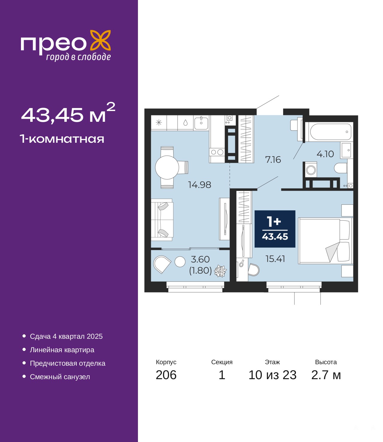 Продается 1-комн. квартира от застройщика с предчистовой отделкой в ЖК "Прео" на 10 этаже. Общая площадь: 43.45 кв.м., жилая: 15.41 кв.м., площадь просторной кухни-столовой: 14.98 кв.м. Все окна выходят на одну сторону. В квартире один совмещенный санузел. Высота потолков 2.7 м.
