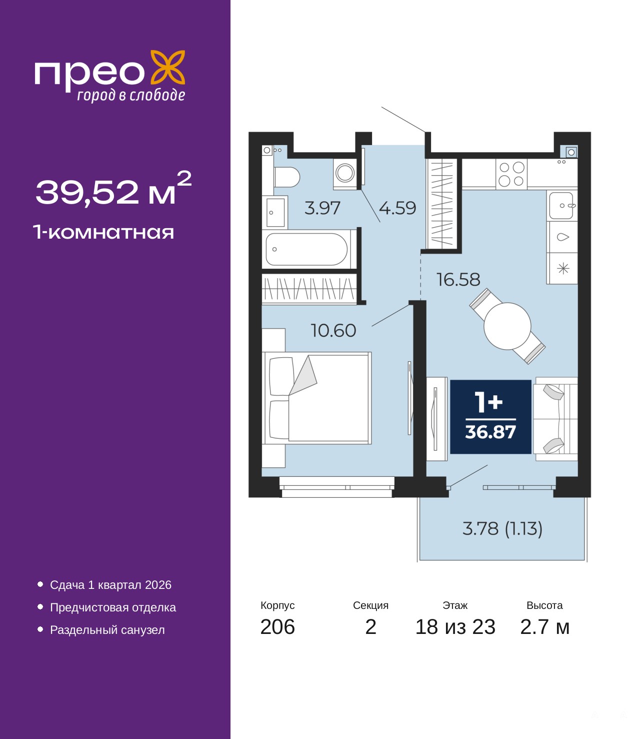 Однокомнатная квартира от застройщика с предчистовой отделкой в ЖК "Прео" на 18 этаже. Общая площадь: 39.52 кв.м. Высота потолков 2.7 м.
