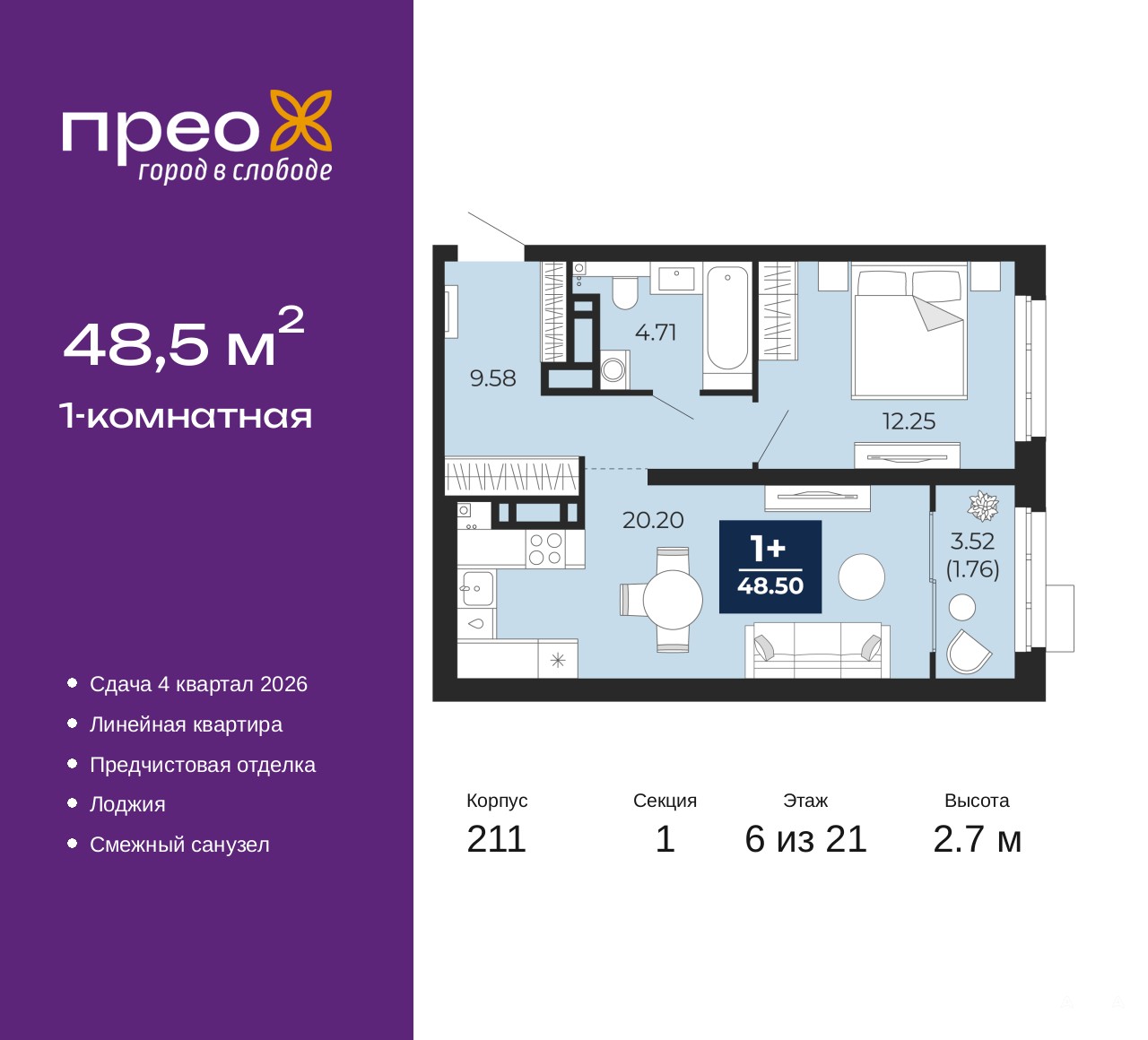 1-комн. квартира от застройщика с предчистовой отделкой в ЖК "Прео" на 6 этаже. Общая площадь: 48.5 кв.м., жилая: 12.25 кв.м., площадь просторной кухни-столовой: 20.2 кв.м. Все окна выходят на одну сторону. В квартире одна лоджия, один совмещенный санузел. Высота потолков 2.7 м.