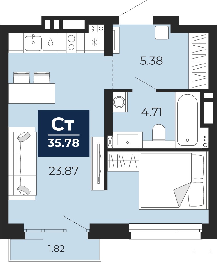 Просторная однокомнатная квартира-студия с предчистовой отделкой в ЖК "Прео" на 12 этаже. Общая площадь: 35.78 кв.м. Высота потолков 2.7 м.
