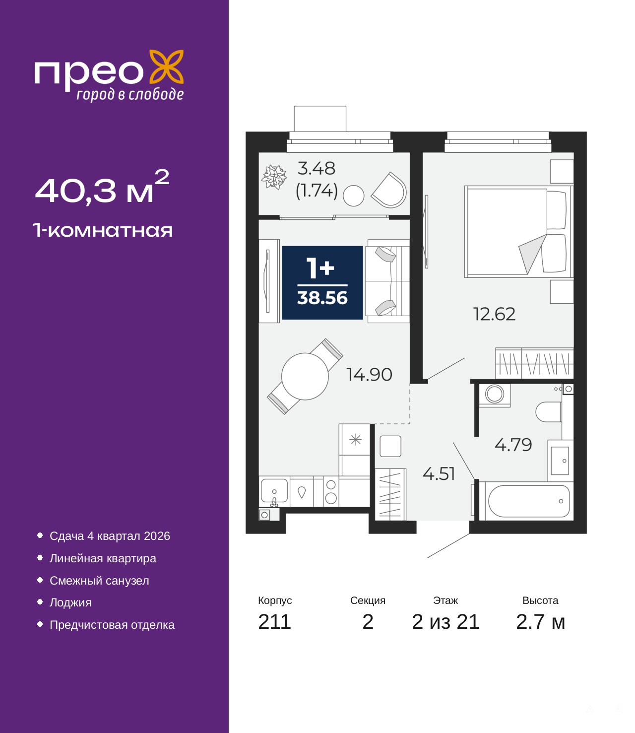 Однокомнатная квартира с предчистовой отделкой в ЖК "Прео" на 2 этаже. Общая площадь: 40.3 кв.м., жилая: 12.62 кв.м., площадь просторной кухни-столовой: 14.9 кв.м. Все окна выходят на одну сторону. В квартире одна лоджия, один совмещенный санузел. Высота потолков 2.7 м.