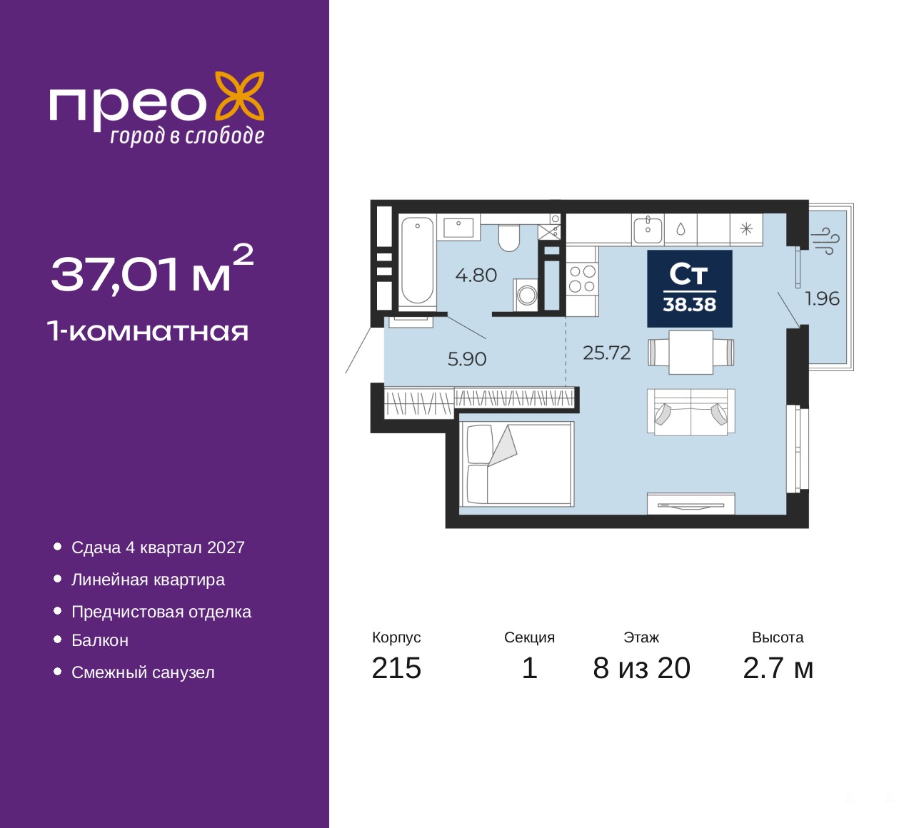 Продается однокомнатная квартира с предчистовой отделкой в ЖК "Прео" на 8 этаже. Общая площадь: 37.01 кв.м., жилая: 20.72 кв.м., площадь кухни: 5 кв.м. Все окна выходят на одну сторону. В квартире один балкон, один совмещенный санузел. Высота потолков 2.7 м.