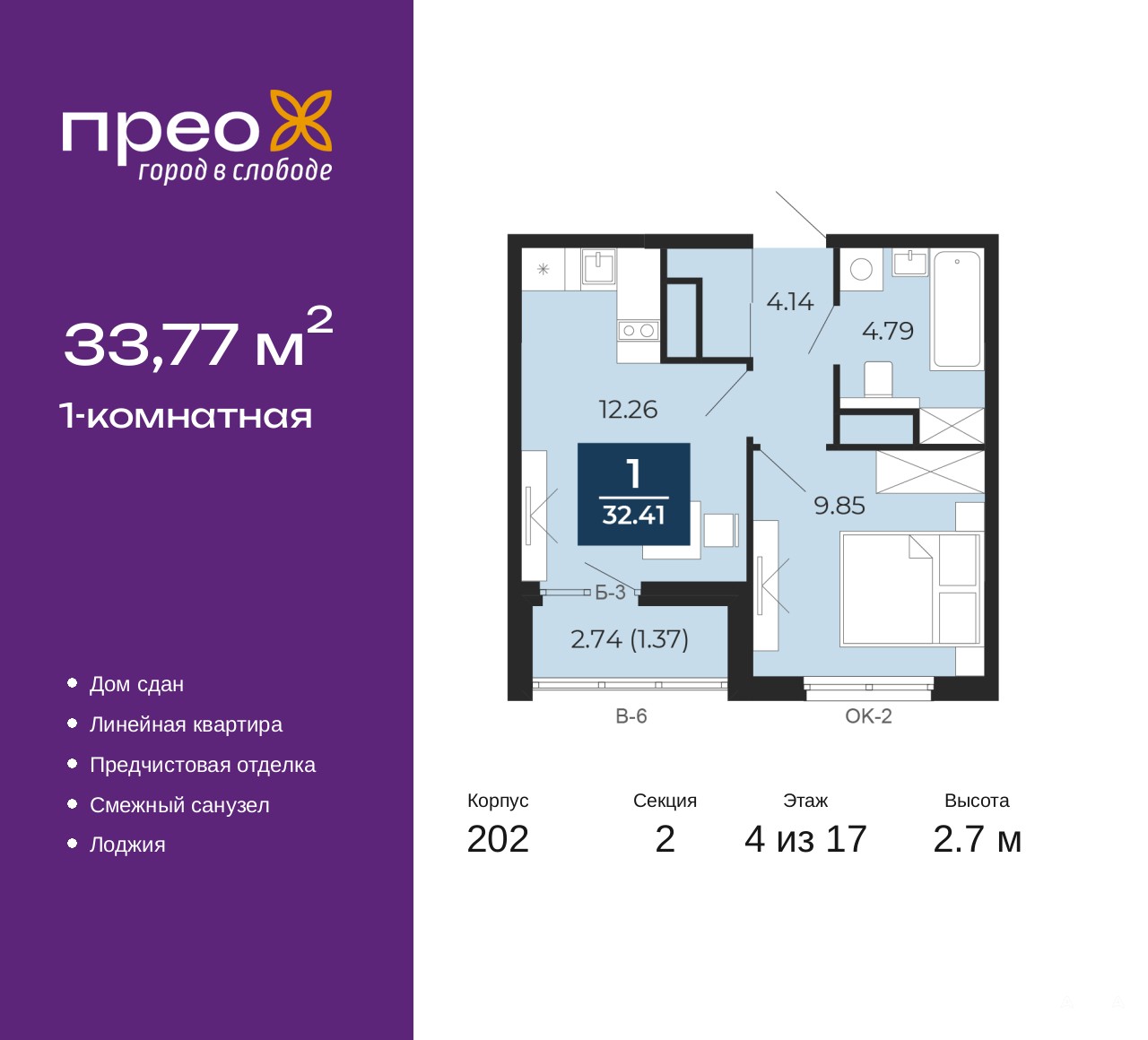 1-комн. квартира от застройщика с предчистовой отделкой в ЖК "Прео" на 4 этаже. Общая площадь: 33.77 кв.м., жилая: 13.83 кв.м., площадь просторной кухни-столовой: 9.85 кв.м. Все окна выходят на одну сторону. В квартире одна лоджия, один совмещенный санузел. Высота потолков 2.7 м.