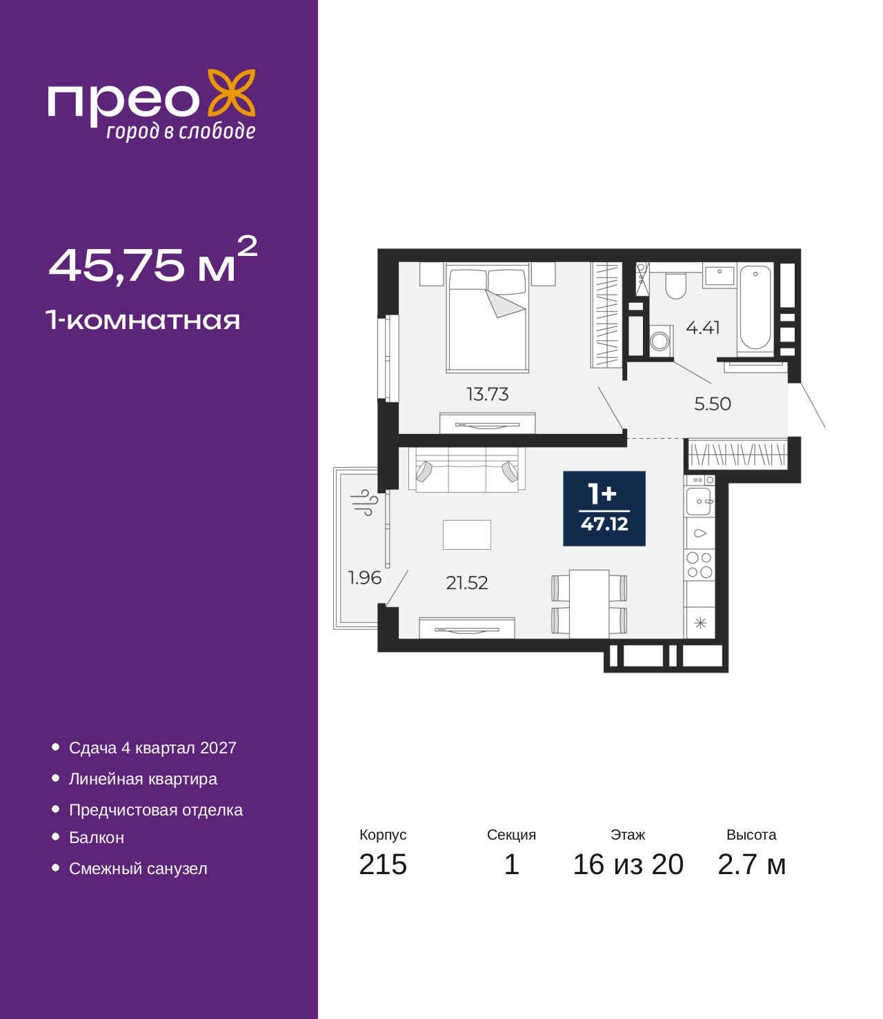 Продается однокомнатная квартира с предчистовой отделкой в ЖК "Прео" на 16 этаже. Общая площадь: 45.75 кв.м., жилая: 13.73 кв.м., площадь просторной кухни-столовой: 21.52 кв.м. Все окна выходят на одну сторону. В квартире один балкон, один совмещенный санузел. Высота потолков 2.7 м.