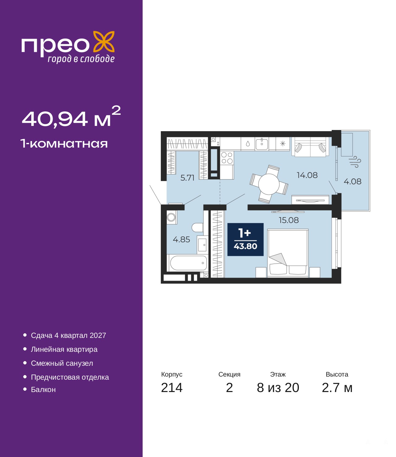 1-комн. квартира от застройщика с предчистовой отделкой в ЖК "Прео" на 8 этаже. Общая площадь: 40.94 кв.м., жилая: 15.08 кв.м., площадь просторной кухни-столовой: 14.08 кв.м. Все окна выходят на одну сторону. В квартире один балкон, один совмещенный санузел. Высота потолков 2.7 м.