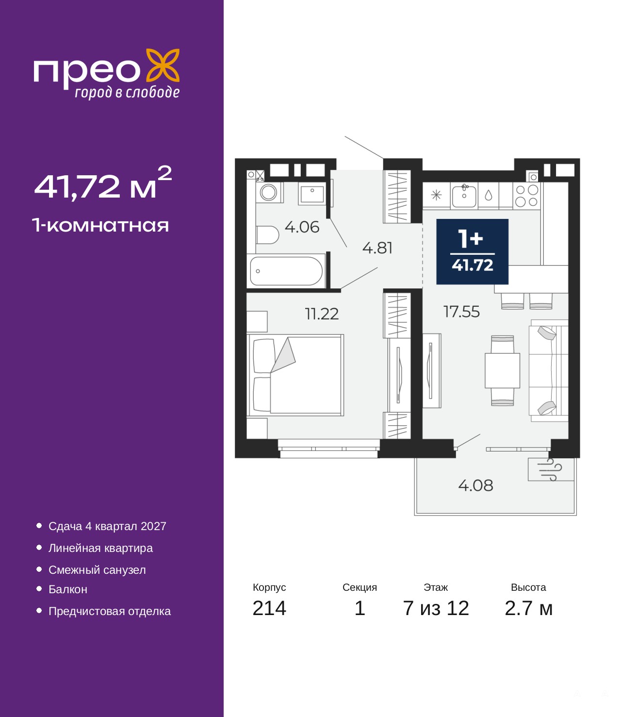 Просторная 1-комн. квартира с предчистовой отделкой в ЖК "Прео" на 7 этаже. Общая площадь: 41.72 кв.м., жилая: 11.22 кв.м., площадь просторной кухни-столовой: 17.55 кв.м. Все окна выходят на одну сторону. В квартире один балкон, один совмещенный санузел. Высота потолков 2.7 м.