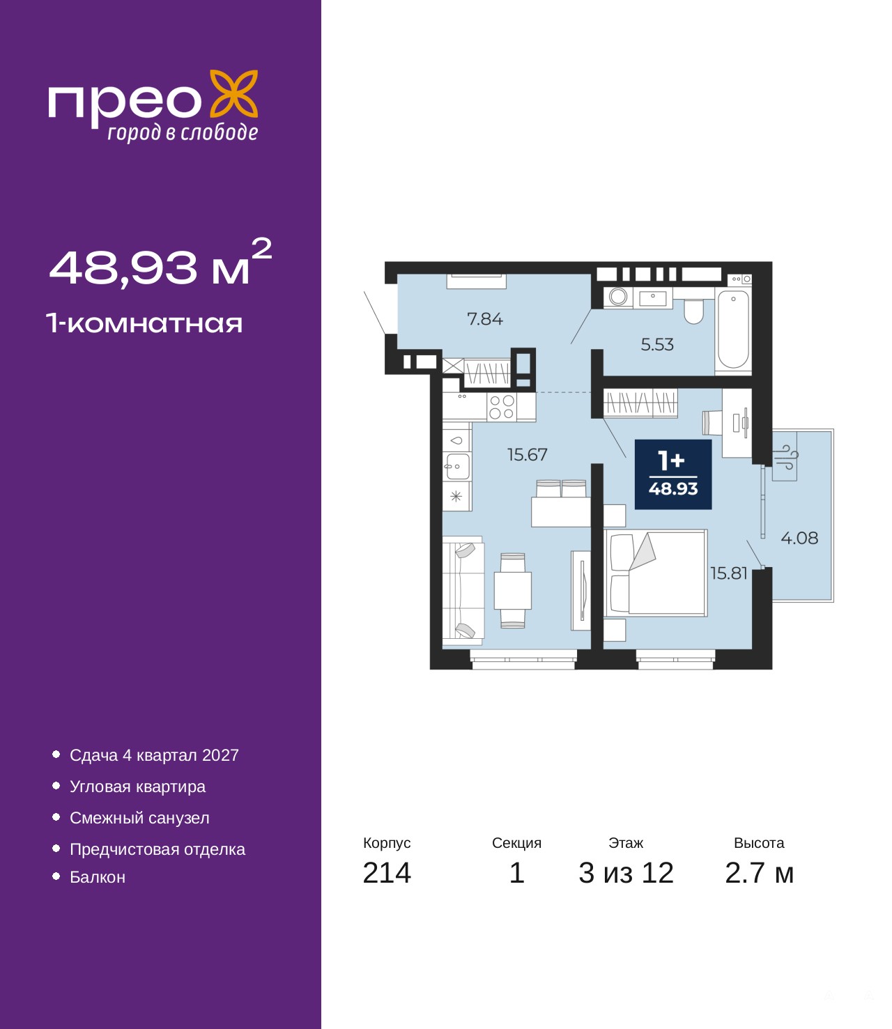 Продается 1-комн. квартира от застройщика с предчистовой отделкой в ЖК "Прео" на 3 этаже. Общая площадь: 48.93 кв.м., жилая: 15.81 кв.м., площадь просторной кухни-столовой: 15.67 кв.м. Угловая квартира, идеально подойдет любителям тишины и панорамных видов. В квартире один балкон, один совмещенный санузел. Высота потолков 2.7 м.