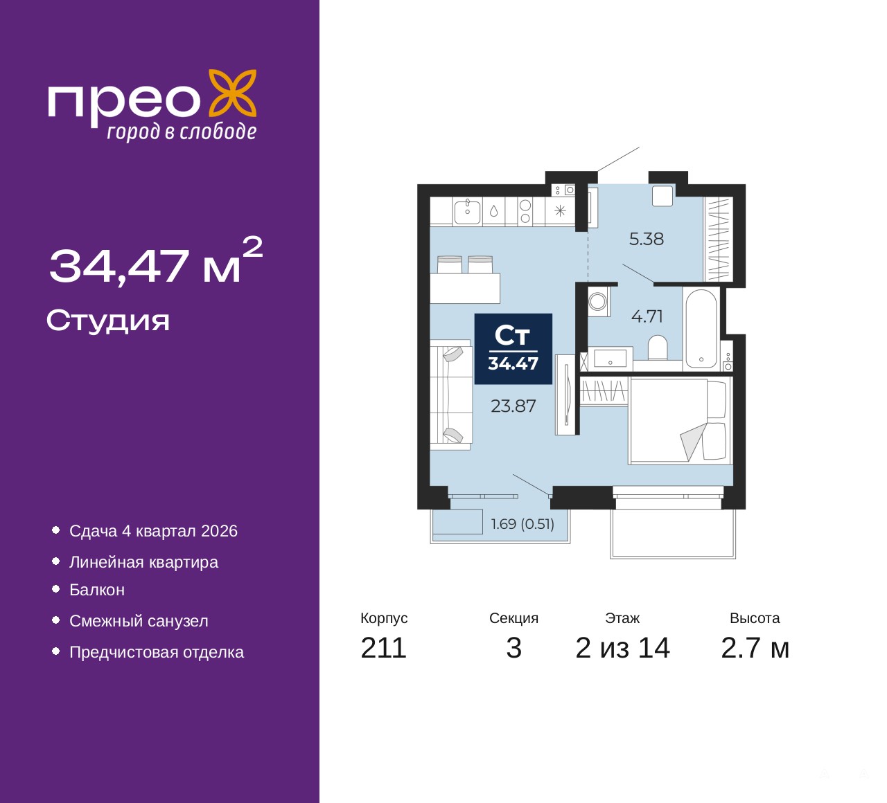 1-комн. квартира-студия от застройщика с предчистовой отделкой в ЖК "Прео" на 2 этаже. Общая площадь: 34.47 кв.м., площадь гостиной 23.87 кв.м., из которых 10 кв.м. выделено под кухонную зону. Все окна выходят на одну сторону. В квартире один балкон, один совмещенный санузел. Высота потолков 2.7 м.