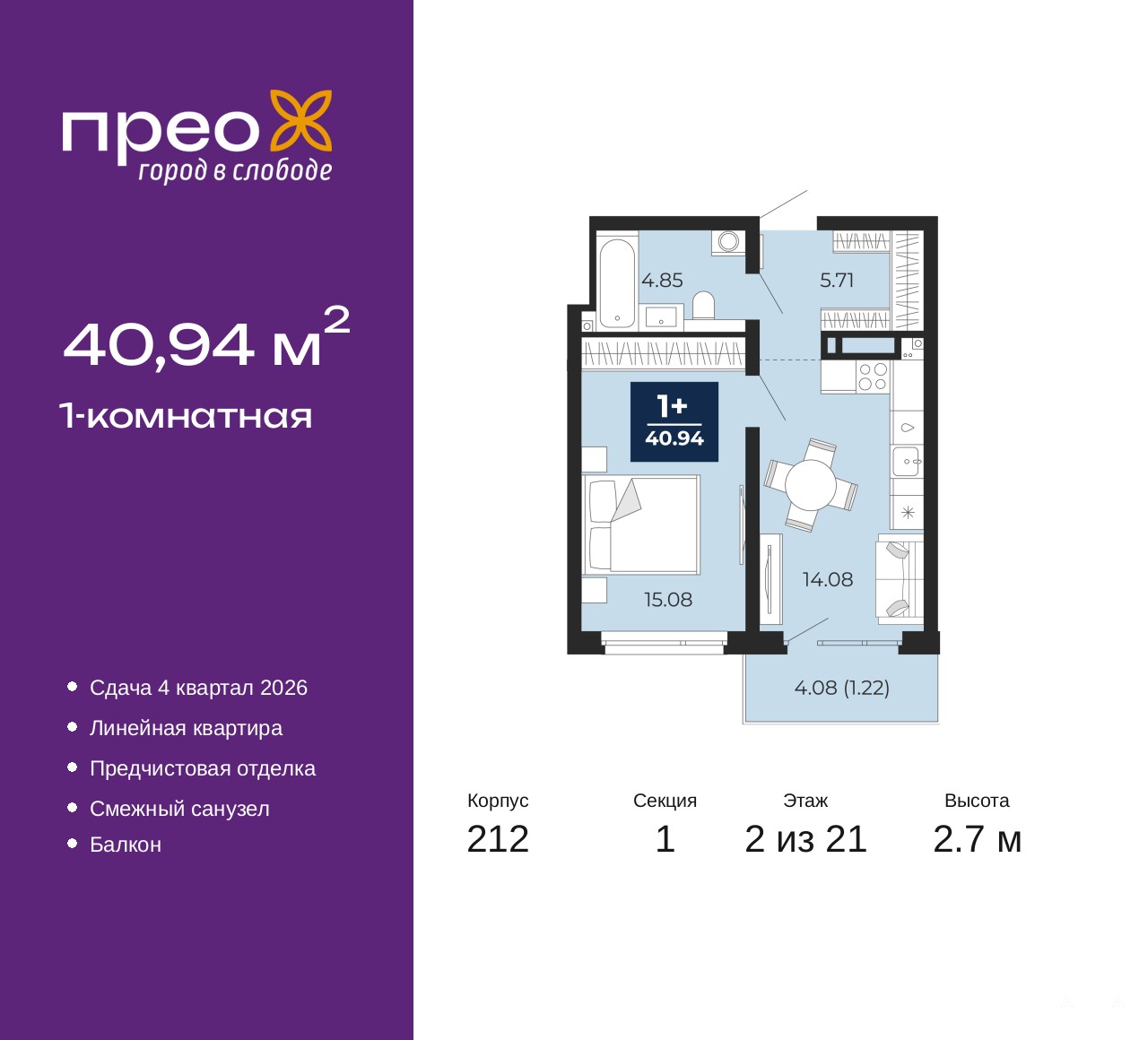 Однокомнатная квартира от застройщика с предчистовой отделкой в ЖК "Прео" на 2 этаже. Общая площадь: 40.94 кв.м., жилая: 15.08 кв.м., площадь просторной кухни-столовой: 14.08 кв.м. Все окна выходят на одну сторону. В квартире один балкон, один совмещенный санузел. Высота потолков 2.7 м.