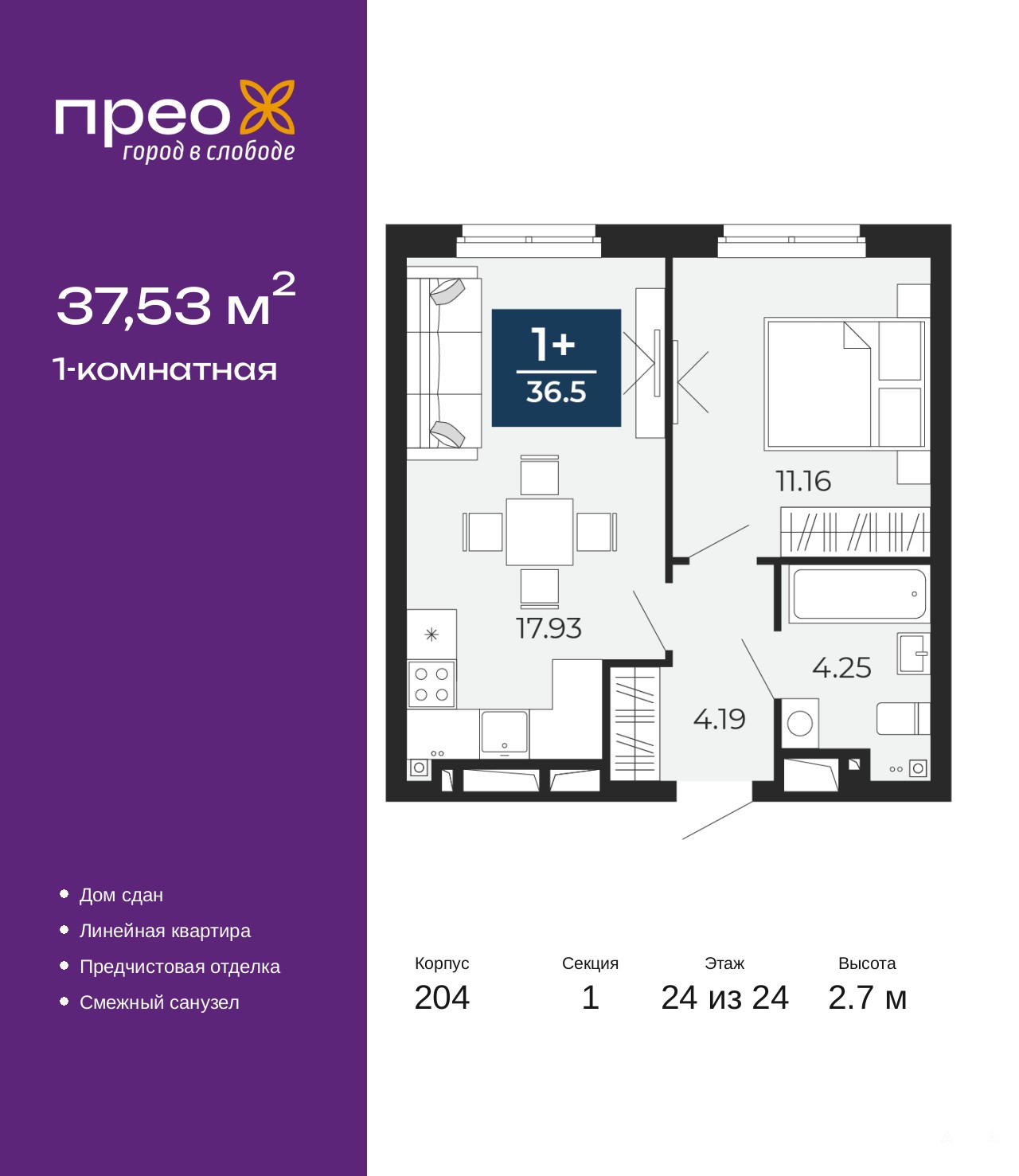 Продается однокомнатная квартира с предчистовой отделкой в ЖК "Прео" на 24 этаже. Общая площадь: 37.53 кв.м., жилая: 11.16 кв.м., площадь просторной кухни-столовой: 17.93 кв.м. Все окна выходят на одну сторону. В квартире один совмещенный санузел. Высота потолков 2.7 м.