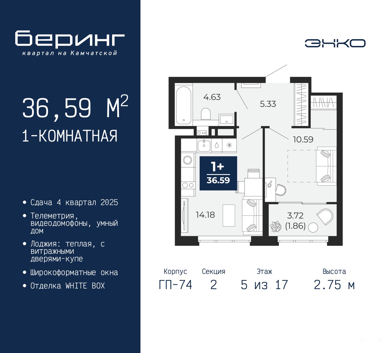 Однокомнатная квартира в ЖК "Беринг" на 5 этаже. Квартира без отделки, новый собственник может сделать ремонт по индивидуальному проекту. Общая площадь: 36.59 кв.м., жилая: 10.59 кв.м., площадь просторной кухни-столовой: 14.18 кв.м. Все окна выходят на одну сторону. В квартире одна лоджия, один совмещенный санузел. Высота потолков 2.75 м.