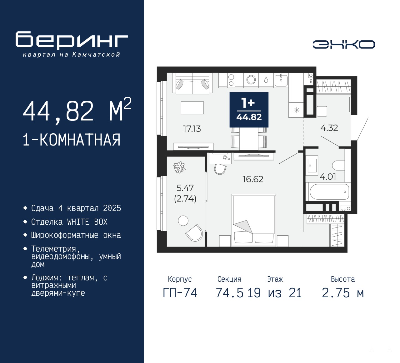 Однокомнатная квартира в ЖК "Беринг" на 19 этаже. Квартира без отделки, новый собственник может сделать ремонт по индивидуальному проекту. Общая площадь: 44.82 кв.м., жилая: 16.62 кв.м., площадь просторной кухни-столовой: 17.13 кв.м. Все окна выходят на одну сторону. В квартире одна лоджия, один совмещенный санузел. Высота потолков 2.75 м.