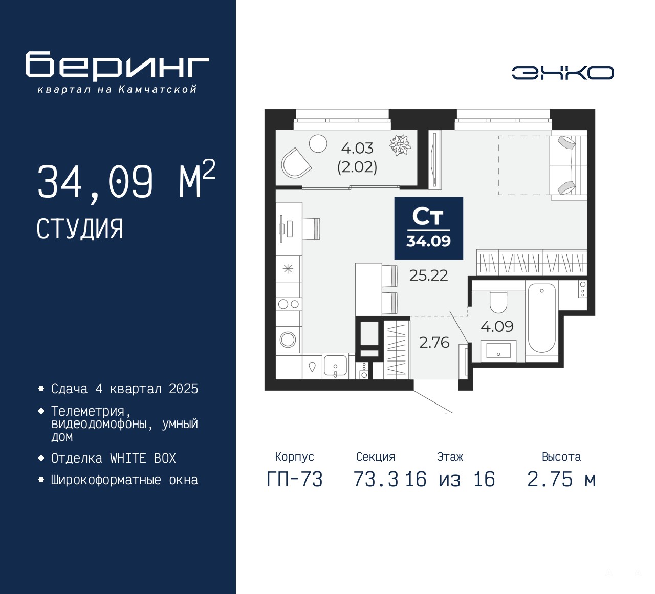1-комн. квартира-студия в ЖК "Беринг" на 16 этаже. Квартира без отделки, новый собственник может сделать ремонт по индивидуальному дизайн-проекту. Общая площадь: 34.09 кв.м., площадь гостиной 25.22 кв.м., из которых 5 кв.м. выделено под кухонную зону. Все окна выходят на одну сторону. В квартире один совмещенный санузел. Высота потолков 2.75 м.
