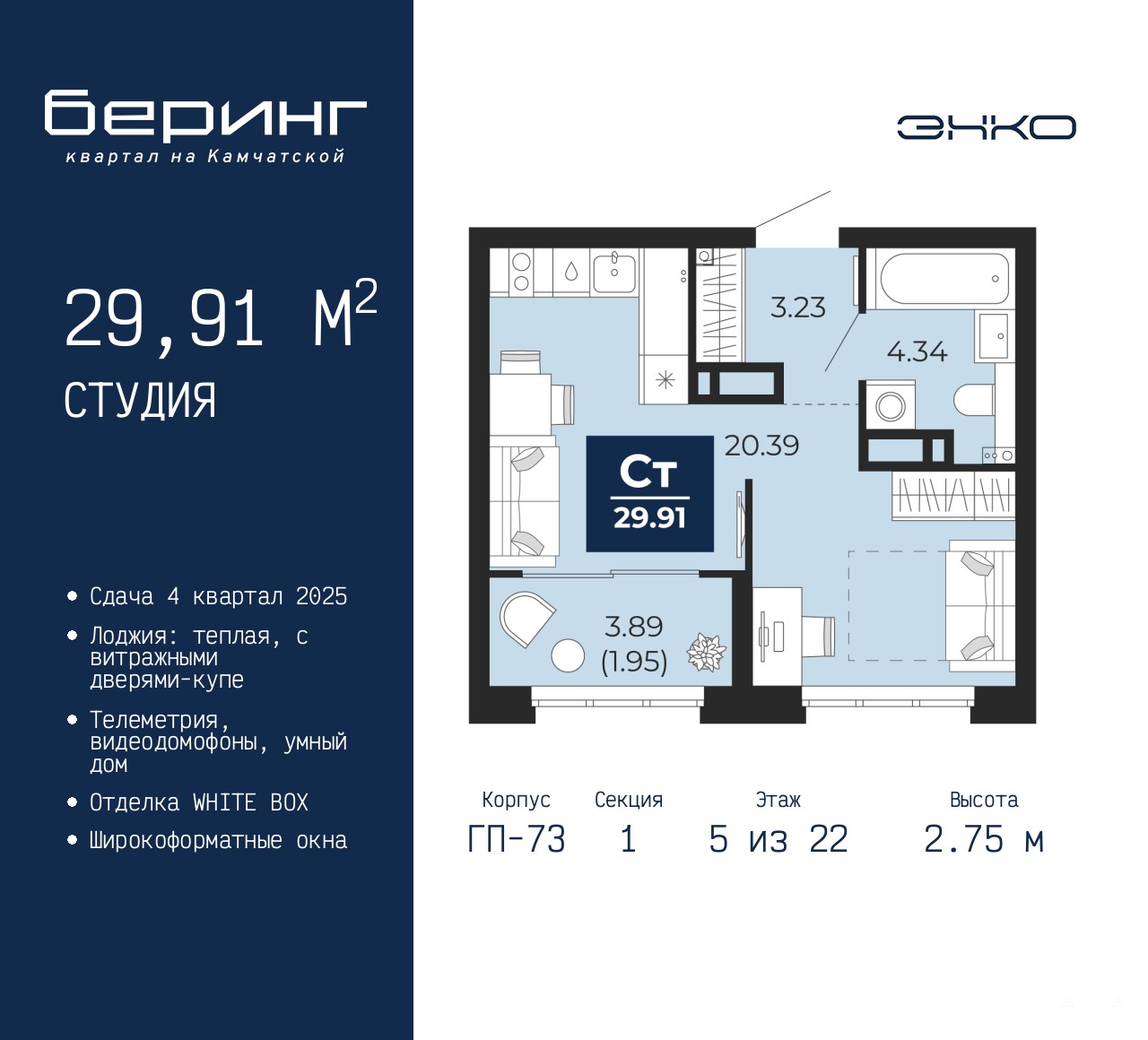 1-комн. квартира-студия от застройщика в ЖК "Беринг" на 5 этаже. Квартира без отделки, новый собственник может сделать ремонт по своему дизайн-проекту. Общая площадь: 29.91 кв.м., площадь гостиной 20.39 кв.м., из которых 5 кв.м. выделено под кухонную зону. Все окна выходят на одну сторону. В квартире одна лоджия, один совмещенный санузел. Высота потолков 2.75 м.