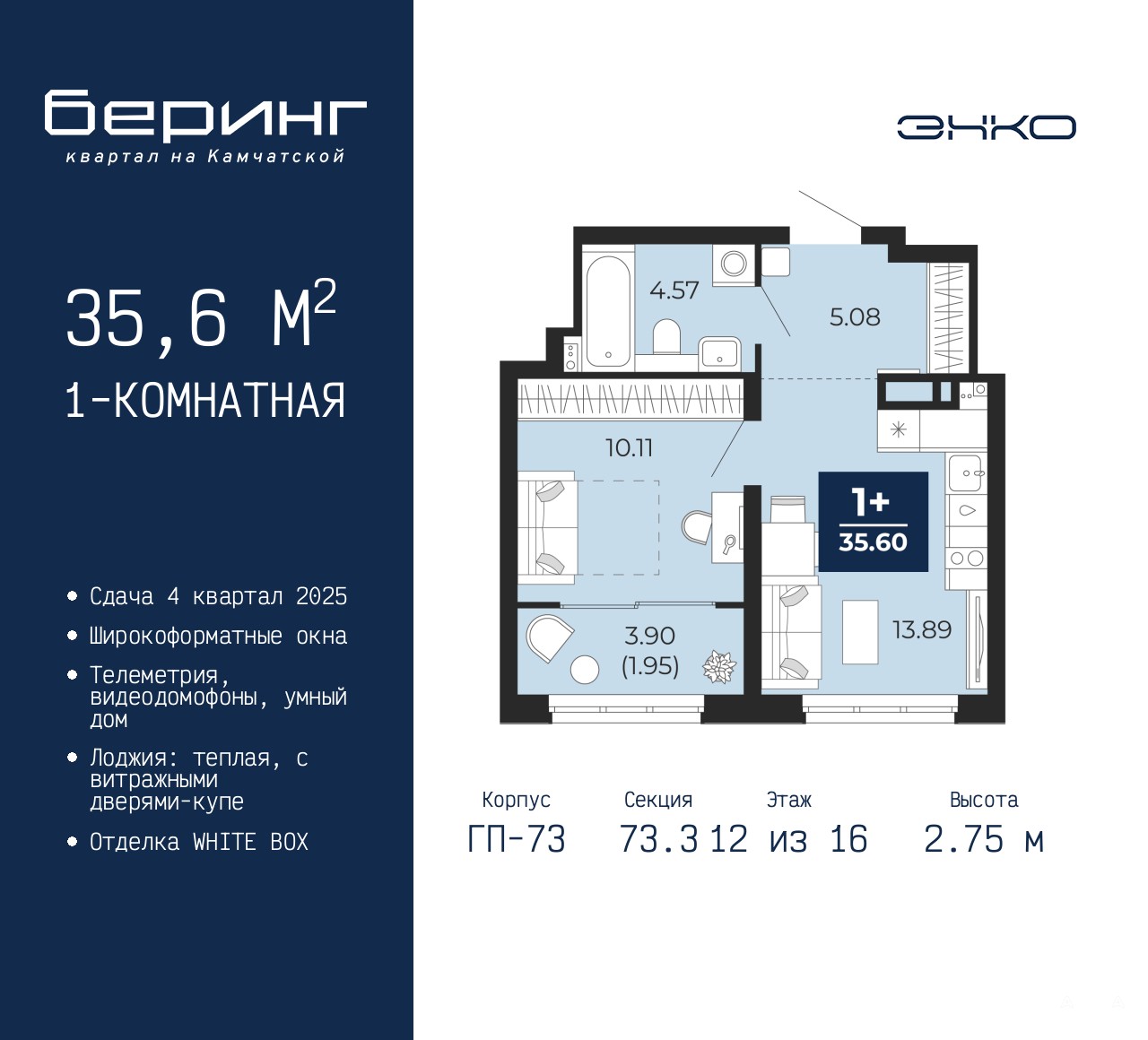Просторная 1-комн. квартира в ЖК "Беринг" на 12 этаже. Квартира без отделки, новый собственник может сделать ремонт по индивидуальному дизайн-проекту. Общая площадь: 35.6 кв.м., жилая: 10.11 кв.м., площадь просторной кухни-столовой: 13.89 кв.м. Все окна выходят на одну сторону. В квартире одна лоджия, один совмещенный санузел. Высота потолков 2.75 м.