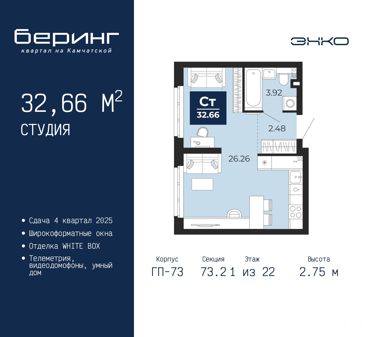 1-комн. квартира-студия с предчистовой отделкой в ЖК "Беринг" на 1 этаже. Общая площадь: 32.66 кв.м., площадь гостиной 26.26 кв.м., из которых 5 кв.м. выделено под кухонную зону. Все окна выходят на одну сторону. В квартире один совмещенный санузел. Высота потолков 2.75 м.