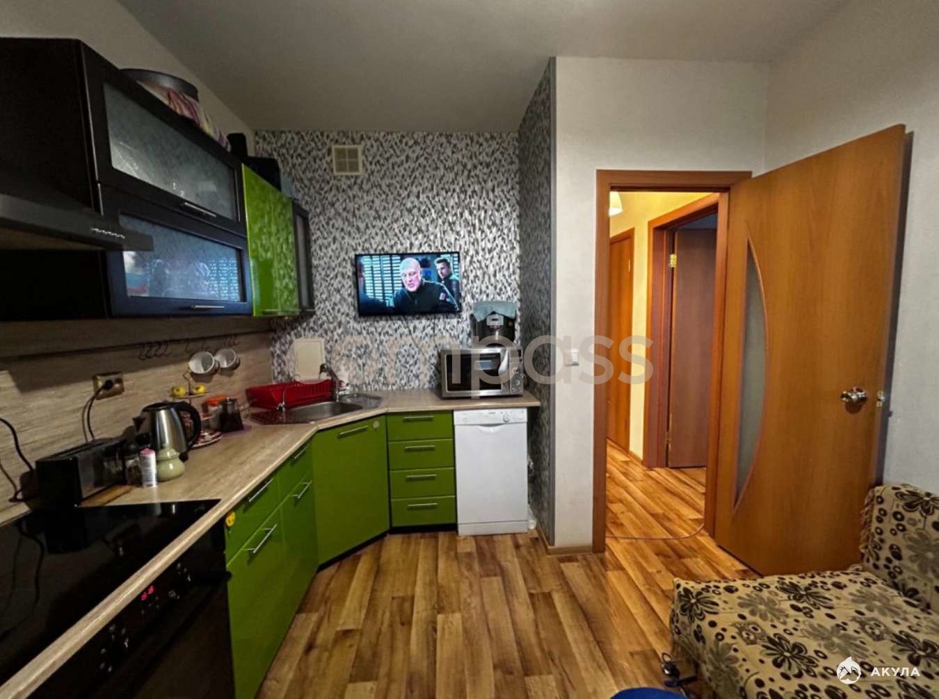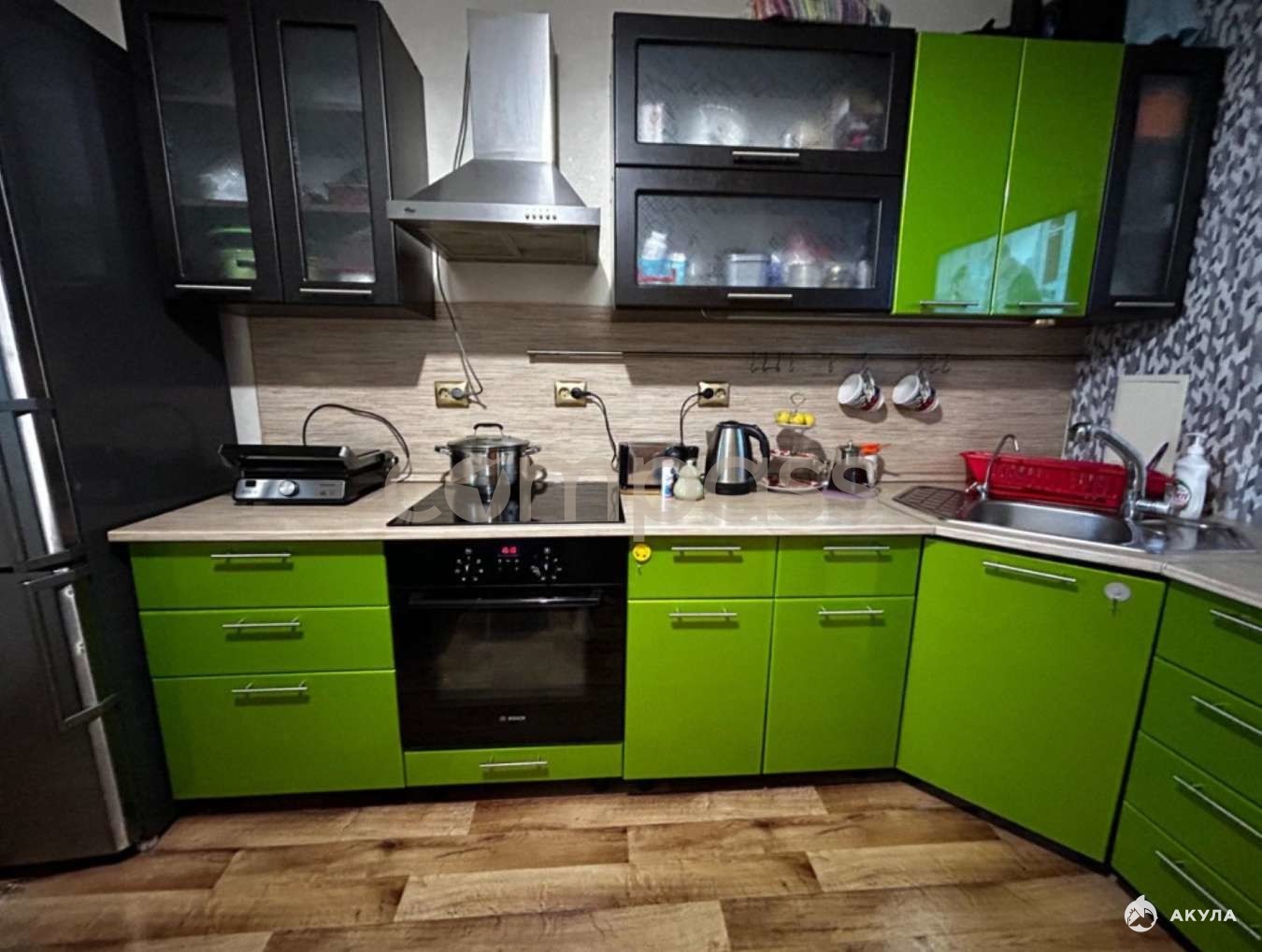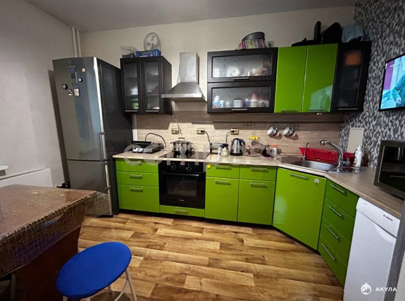 При продаже в квартире многое остаётся, в кухне: кухонный гарнитур, варочная поверхность, духовой шкаф, вытяжка, посудомоечная машина, холодильник, микроволновая печь, стол, стулья, диван.