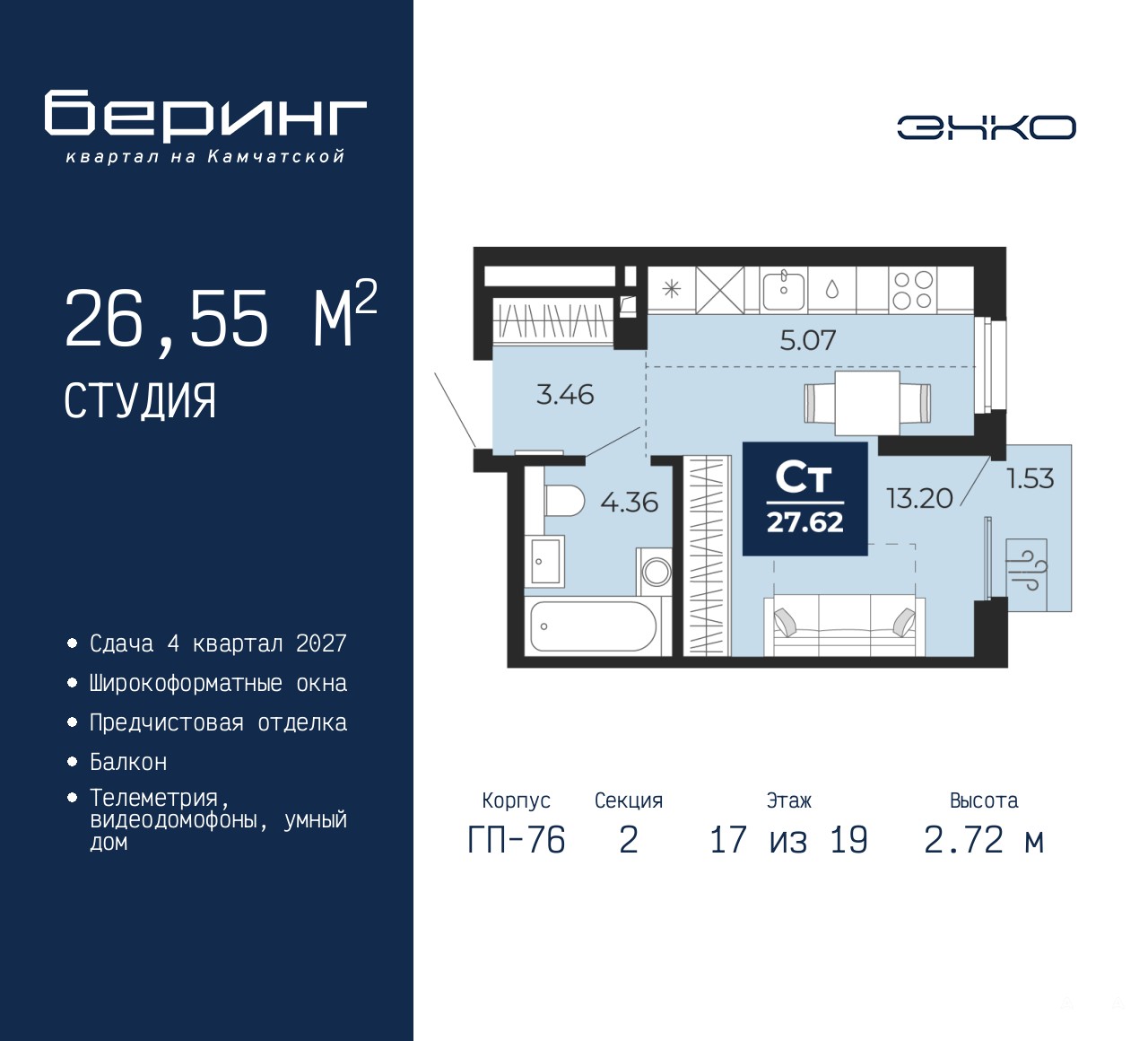 Продается однокомнатная квартира-студия от застройщика с предчистовой отделкой в ЖК "Беринг" на 17 этаже. Общая площадь: 26.55 кв.м., площадь гостиной 18.27 кв.м., из которых 5.07 кв.м. выделено под кухонную зону. Все окна выходят на одну сторону. В квартире один балкон, один совмещенный санузел. Высота потолков 2.72 м.