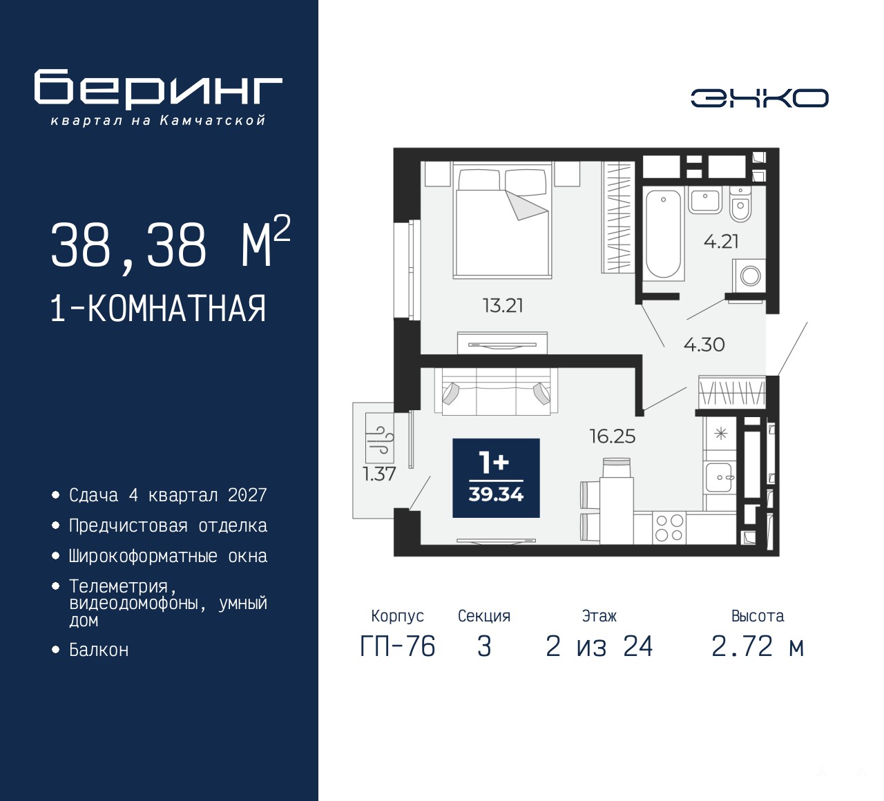 Однокомнатная квартира с предчистовой отделкой в ЖК "Беринг" на 2 этаже. Общая площадь: 38.38 кв.м., жилая: 13.21 кв.м., площадь просторной кухни-столовой: 16.25 кв.м. Все окна выходят на одну сторону. В квартире один балкон, один совмещенный санузел. Высота потолков 2.72 м.