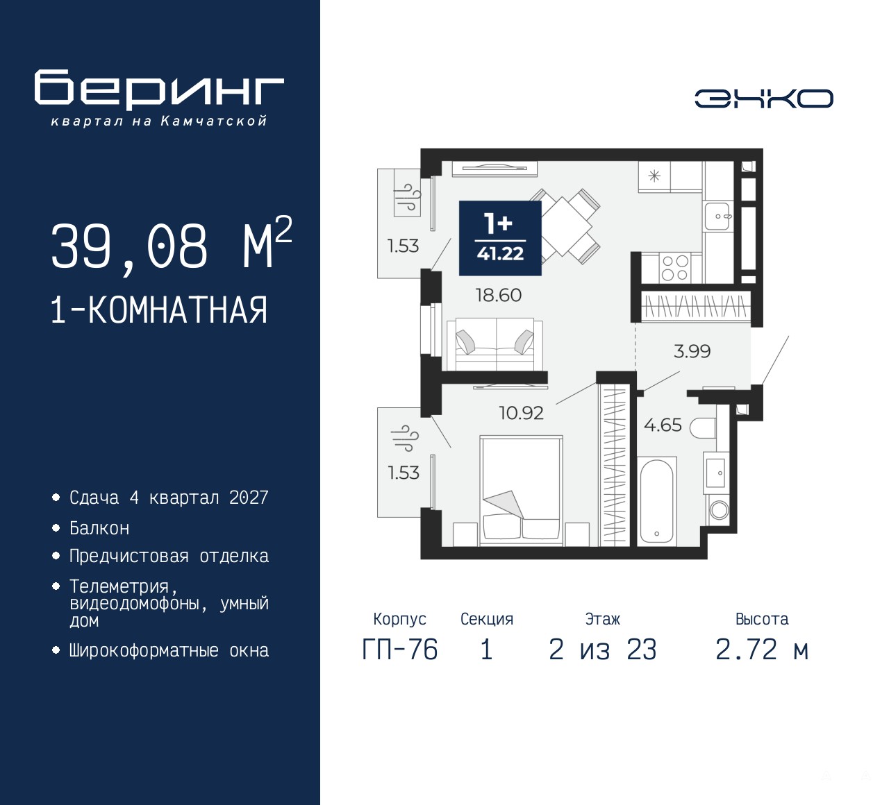 1-комн. квартира с предчистовой отделкой в ЖК "Беринг" на 2 этаже. Общая площадь: 39.08 кв.м., жилая: 10.92 кв.м., площадь просторной кухни-столовой: 18.6 кв.м. Все окна выходят на одну сторону. В квартире два балкона, один совмещенный санузел. Высота потолков 2.72 м.