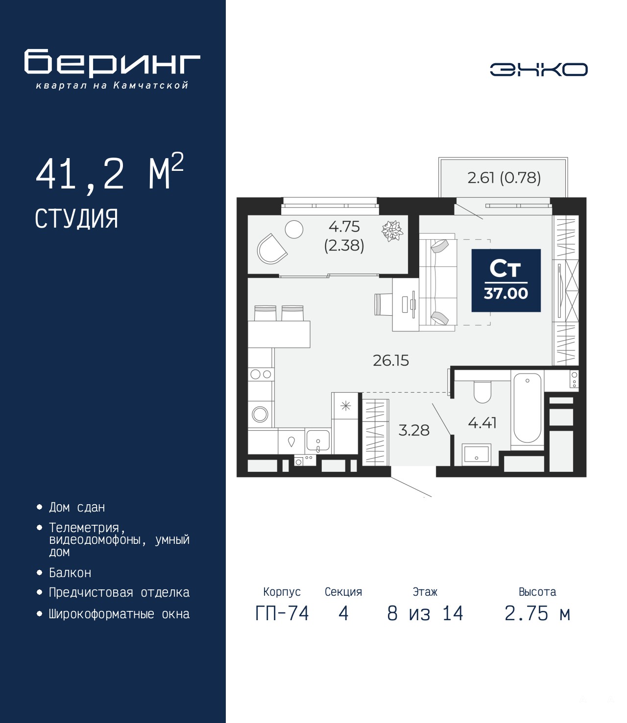Продается 1-комн. квартира-студия от застройщика с предчистовой отделкой в ЖК "Беринг" на 8 этаже. Общая площадь: 41.2 кв.м., площадь гостиной 26.15 кв.м., из которых 10 кв.м. выделено под кухонную зону. Все окна выходят на одну сторону. В квартире один балкон, один совмещенный санузел. Высота потолков 2.75 м.