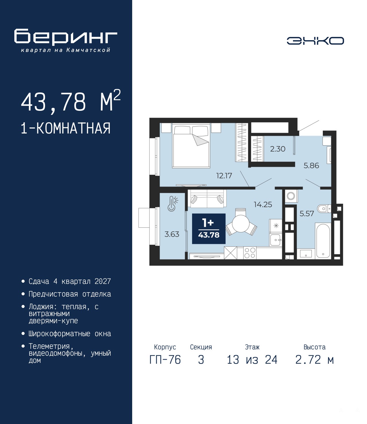 Однокомнатная квартира с предчистовой отделкой в ЖК "Беринг" на 13 этаже. Общая площадь: 43.78 кв.м., жилая: 12.17 кв.м., площадь просторной кухни-столовой: 14.25 кв.м. Все окна выходят на одну сторону. В квартире одна лоджия, один совмещенный санузел. Высота потолков 2.72 м.