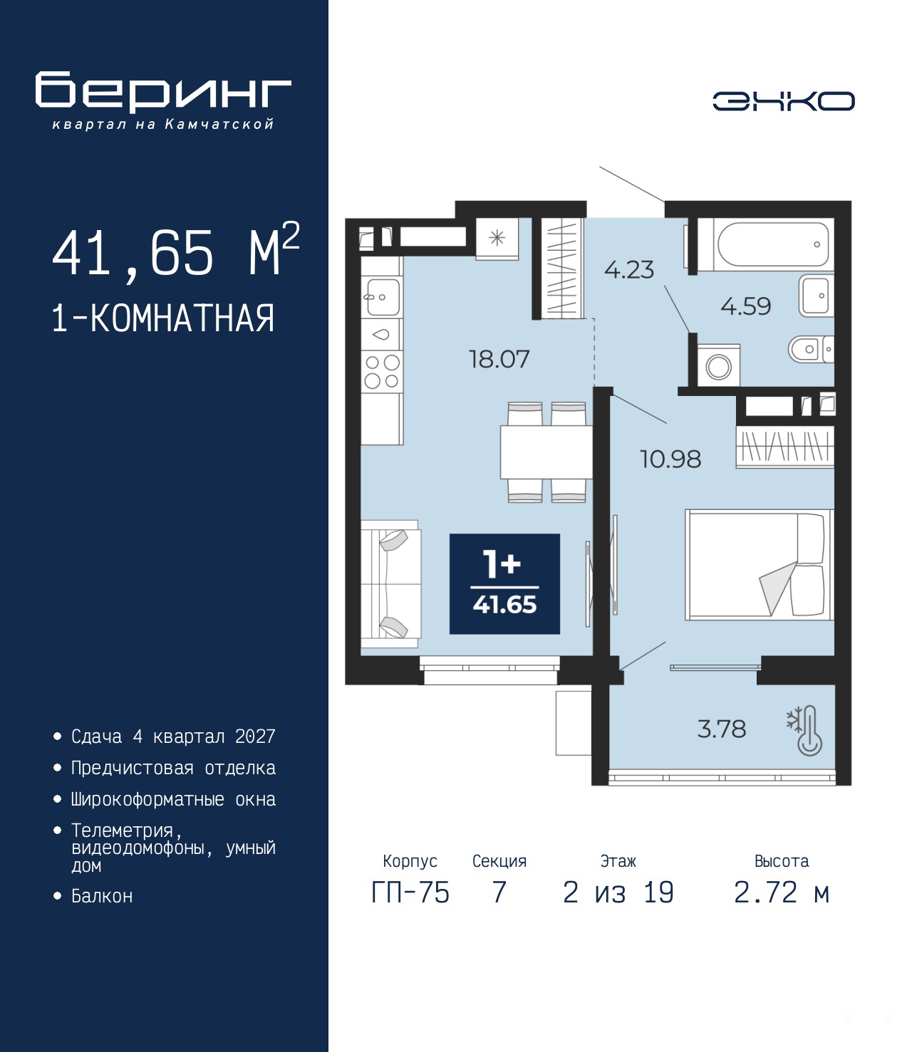 1-комн. квартира от застройщика с предчистовой отделкой в ЖК "Беринг" на 2 этаже. Общая площадь: 41.65 кв.м., жилая: 10.98 кв.м., площадь просторной кухни-столовой: 18.07 кв.м. Все окна выходят на одну сторону. В квартире один балкон, один совмещенный санузел. Высота потолков 2.72 м.